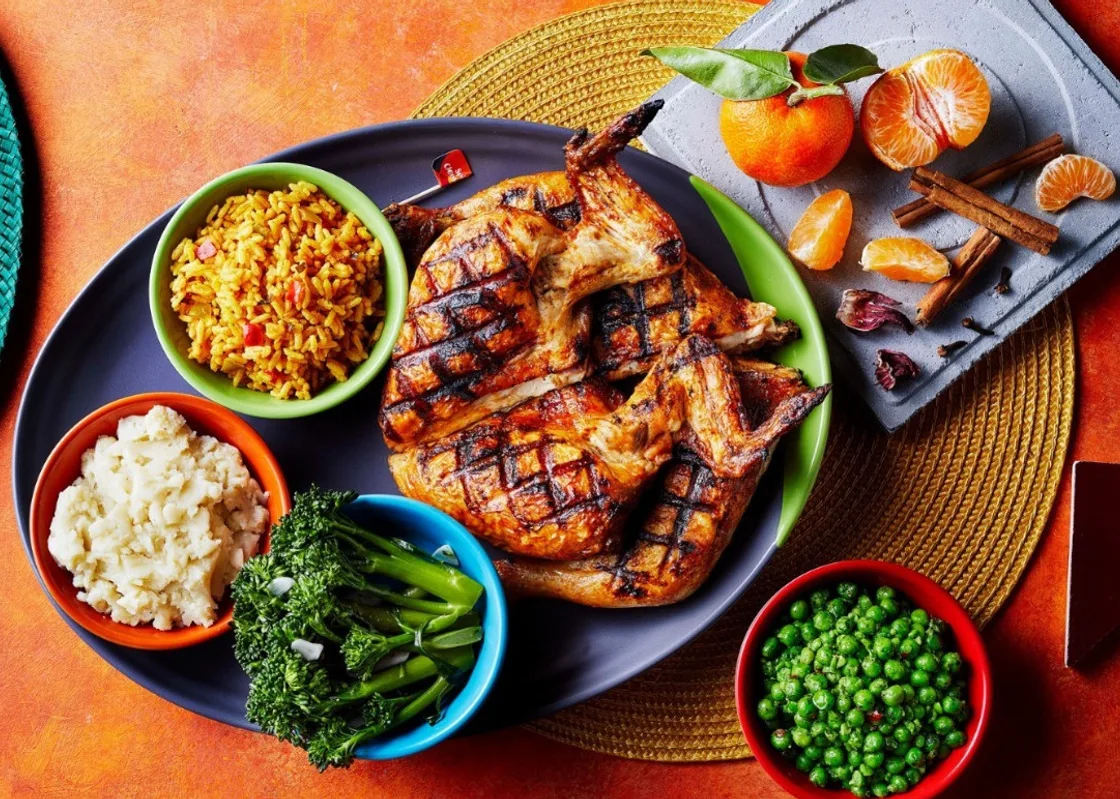 Il piatto principale di Nando’s è il pollo alla griglia marinato con salsa peri-peri, preparato con il peperoncino African Bird’s Eye. La cucina combina influenze portoghesi e africane, offrendo una varietà di piatti come prego (panini con bistecca), espetada (spiedini) e opzioni vegetariane, accompagnati da contorni tradizionali come pane portoghese e insalate.